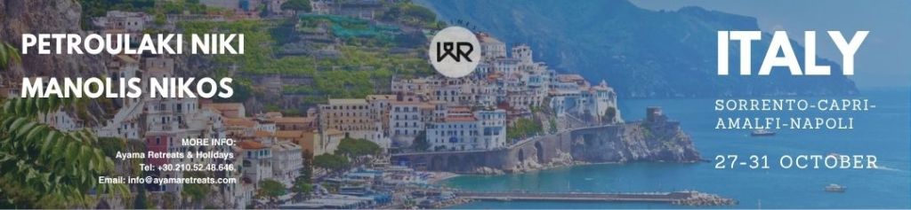 Έxουμε οργανώσει με το Ayama Retreats ένα ξεχωριστό retreat στη νότια Ιταλία με ιταλική φινέτσα, φυσική ομορφιά και ιστορικές ξεναγήσεις. Με βάση το μαγευτικό Sorrento και θέα στον επιβλητικό Βεζούβιο δημιουργούμε χώρο για πρακτική, χαλάρωση και σύνδεση με το ταξίδι. Με καθημερινές στιγμές ευεξίας, εξερεύνησης και αυθεντικές εμπειρίες θα ανακαλύψουμε μερικούς από τους πιο εμβληματικούς προορισμούς της περιοχής όπως το κοσμοπολίτικο Κάπρι, την εντυπωσιακή Αμάλφι Coast και την ιστορική Πομπηία. Ένα ταξίδι αισθήσεων και πολιτισμού.